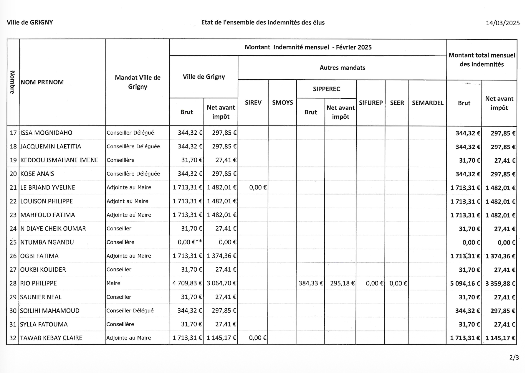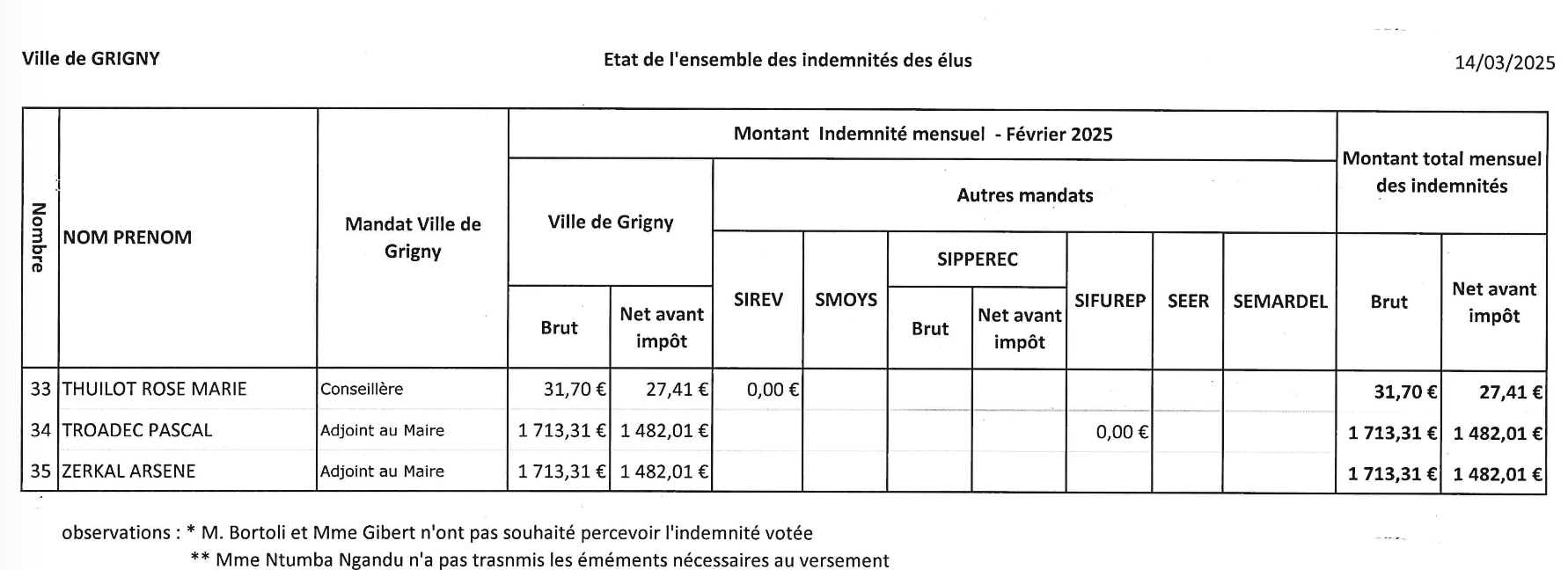 Ce qui veut dire (pure hypothèse incongrue), que si le maire avait perçu d’autres indemnités au titre de son rôle dans d’autres organismes que le SIPPEREC, dans le cours de l’année 2024, celles-ci n’apparaîtraient pas dans l’état des indemnités qui a été fourni… puisque celui-ci concerne uniquement le mois de février 2025 !